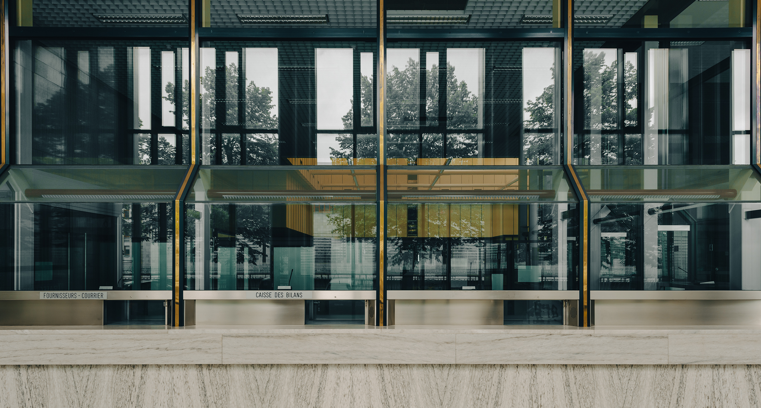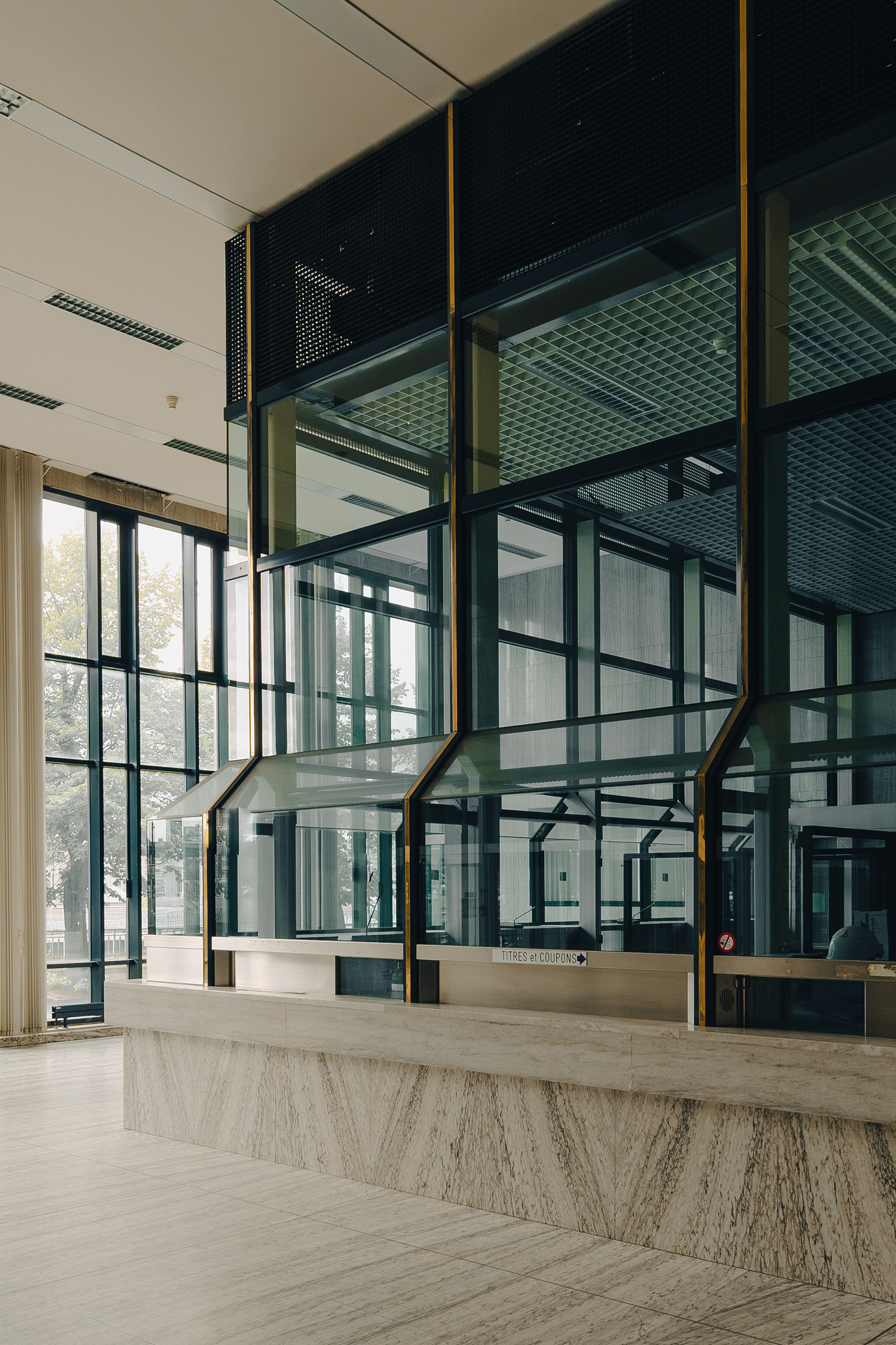 Redevelopment of the Banque National de Belgique, in Charleroi. This building was a former bank, designed in the 1960s by architect Marcel Van Goethem. The renewal project was awarded to Brussels based V+ Architects, who transformed the building into Quai10 – Center for Animated and Interactive Images. These photos show the original interior of the bank pre-renovation.